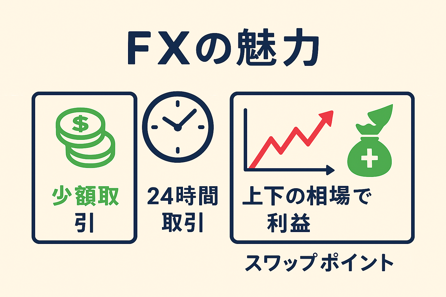 FXは、少額から始められ、時間や相場の方向に縛られず、自由度の高い投資ができるのが最大の魅力です。もちろんリスクもありますが、正しい知識とルールを持てば、初心者でも着実にステップアップできます。