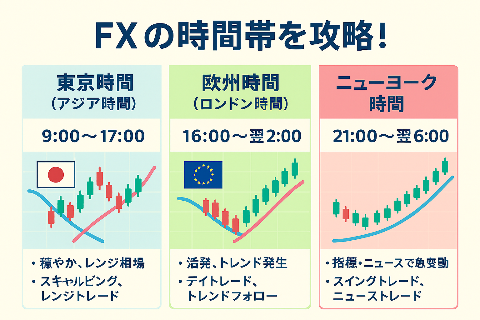 FXの時間帯を理解することで、より戦略的なトレードが可能になります。あなたのライフスタイルや得意な手法に合わせて、最適な時間帯を選びましょう!