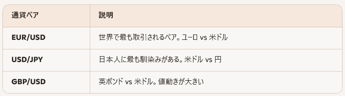特に以下の3つは「メジャーペア」と呼ばれ、世界で最も取引されています。